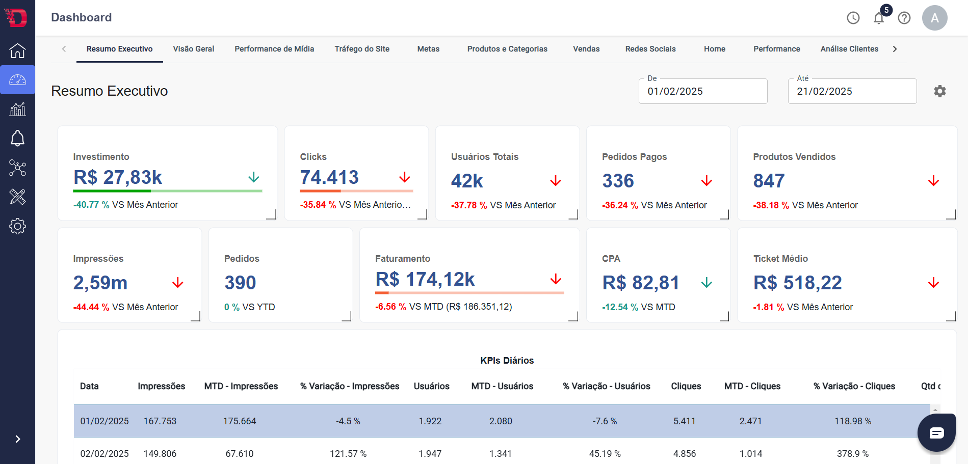 Nos painéis já criados, você encontrará informações sobre vendas, produtos, categorias e o desempenho das suas campanhas de mídias. Esses painéis te permitem ter insights imediatos sobre o desempenho seu negócio em áreas chave, sem a necessidade de configurar tudo zero: eles servem como ponto de partida para uma análise mais aprofundada.