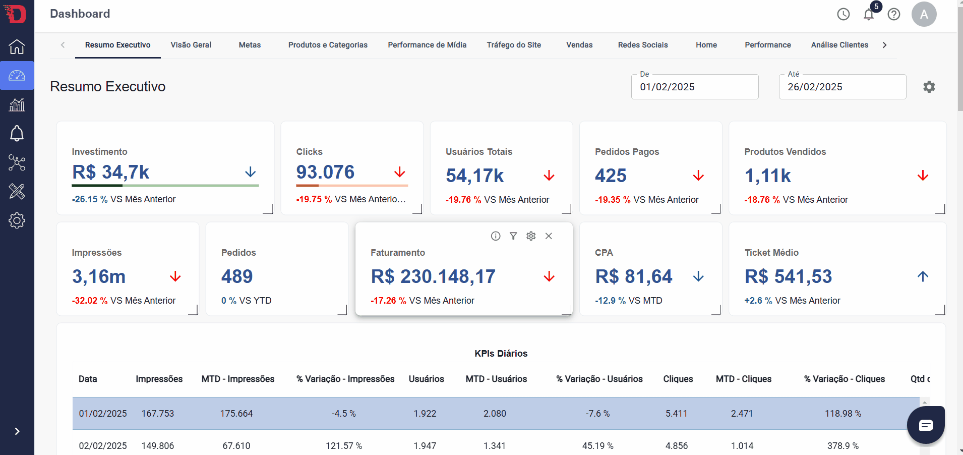 Também é possível criar comparar métricas nos gráficos de tabela. Com ela você pode comparar o MTD, Mês Passado, YTD, Período Equivalente, Meta Mensal e a Meta Diária. Para acessar clique na engrenagem da tabela e em seguida "editar". Ao salvar alteração, serão criadas colunas com as métricas selecionadas, veja exemplo: