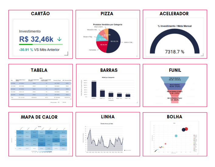 Gráficos de barras, bolhas, acelerador ou pizza são recomendados para comparar categorias ou mostrar composições.