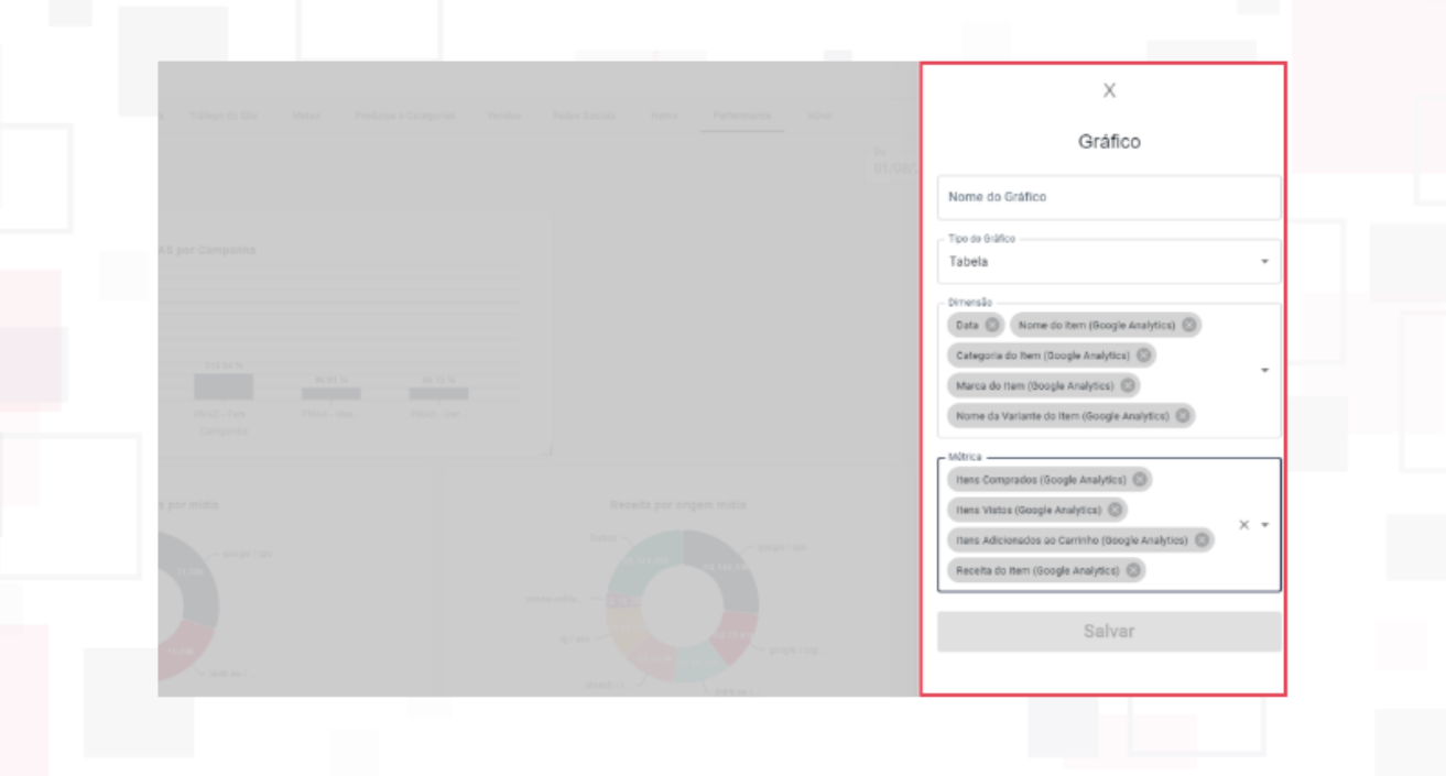Lançamos novas dimensões e métricas a partir do Google Analytics e-commerce para que você acompanhe os resultados de vendas dos itens vendidos. Você pode usar as métricas de itens vistos, itens adicionados ao carrinho, itens comprados e receita dos itens. E ainda pode usar as dimensões nome dos itens, marca e categoria. Para isso, basta criar um gráfico selecionando as métricas e dimensões relacionadas a Google Analytics e-commerce. Confira a listagem completa dos KPIs disponíveis.