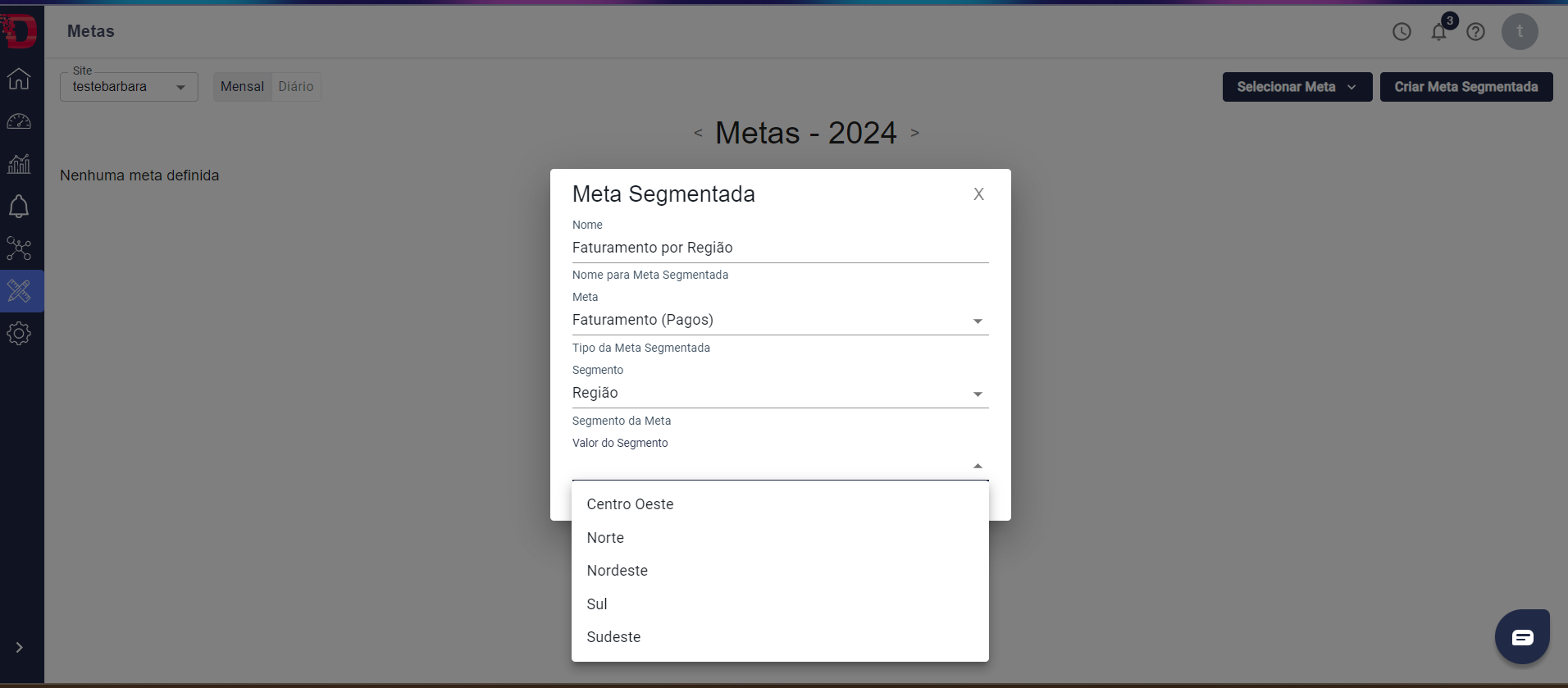 Já está disponível a criação de metas segmentadas. Com ela você pode escolher o "tipo de meta", o "segmento" e o "valor do segmento" (Por exemplo: "Faturamento (Pagos), "região", "Sudeste"). E no Dashboard você poderá fixar o filtro pelo segmento correspondente. (Exemplo: Faturamento). Para criar o segmento vá em "Personalizar", "Metas", "Criar metas segmentadas". Saiba mais em Metas.